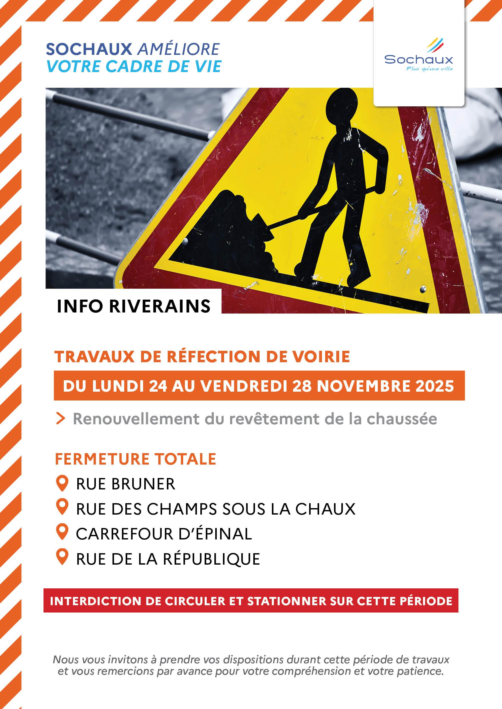 Dans le cadre de l’amélioration continue du cadre de vie des habitants, la Ville de Sochaux entreprendra des travaux de réfection de voirie du lundi 24 au vendredi 28 novembre 2025.